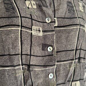 Allison Taylor Petite blouse from the 1990s. Black, white, and gray graphic design with stripes and squares. Abalone buttons up the front and at the wrists. 100% silk.