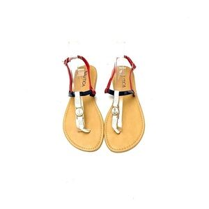 Vintage 1990s Americana patent leather Capri sandals by Nautica. Features red, white and blue strappy patent leather uppers; with gold tone anchor medallion, leather insole, elastic at heel strap for best fit, and extremely thin block heel. Excellent vintage condition.