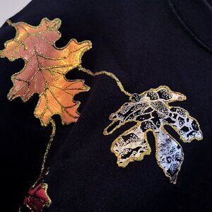 Nothing says cozy retro "Autumn Vibes" like an oversized sweatshirt and puffpaint leaf appliques! Judging from the sweatshirt brand, this gem was handmade by a crafty gal. She scooped up a blank, lovingly slapped some funky leaves on it, then topped it off with glitter puff paint. Awesome!