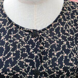 Chelsea Dress / Vintage 1990's black floral rayon midi dress by Putumayo. Inky black, crinkly cool 100% lightweight rayon with a cream and pink vining floral print. Scoop neck with long length sleeves. Fitted v-waist with a slight flare from the hips. Pullover style with no zippers or closures (keep that in mind when considering fit). Has floral buttons down the bodice to just above the waist. Unlined, no shoulders pads.