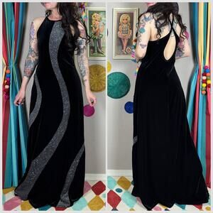 A 90s cocktail dress with just a touch of sparkle! Featuring a sleeveless bodice with a high halter neckline and large open cutout keyhole in back with crisscross straps. A-line silhouette. Comes in a black stretch velvet with metallic silver twinkling glitter in a wavy pattern down the front. Slip on style.