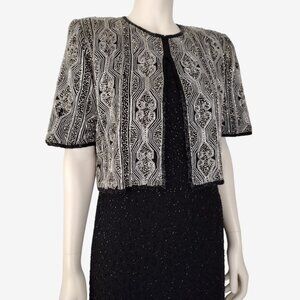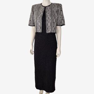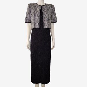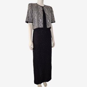 Vintage 1990s Black White Heavily Beaded Maxi Dress With Attached Jacket