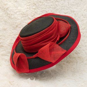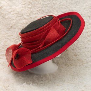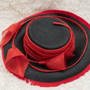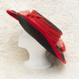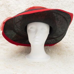 Large black and red vintage hat. This has features a ride brim that is trimmed in a red cotton fabric. The hat is accented with red calla lilies.
