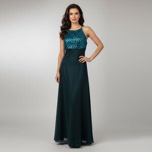 Vintage 90s Blondie Nites maxi length prom dress. Blue iridescent overlay with sequin top. Mermaid/siren colors. High neck. Zip up back. Lined. Dress is in good vintage condition with repair to strap in back and a small pull in fabric. Please see photos.