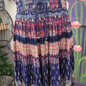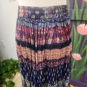 Vintage 1990's gem tone blue & purple cotton print pleated maxi skirt by Papillon. This skirt is straight out of Practical Magic's wardrobe I swear! Perfect 1990's boho skirt! 100% lightweight India cotton in gem tones of purples, blues, and pinks with mixed floral and paisley prints. Accordion pleats that spread into a full sweep. Elastic waist with cinch waist with brass tone bells attached at the waist. Unlined, very lightweight cotton fabric. Pull up style with no zippers or closures.