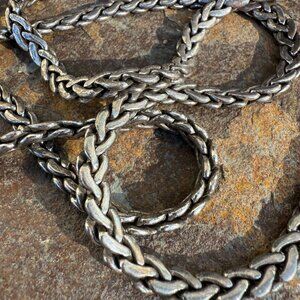 It measures 8 1/2" wide at the bottom and 7 1/2" wide at the top. 6" tall. The metal chain strap is 48" long. Metal has tarnish is this is 30 years old. Also has some scuffs and wear.