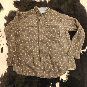 Blue background, long sleeve, button down vintage shirt with all-over duck print. Men's size XL