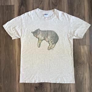 Vintage 1990s Cat T-Shirt Men's Size L Gray Napping Kitty