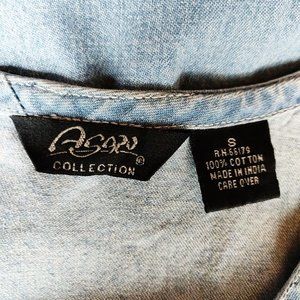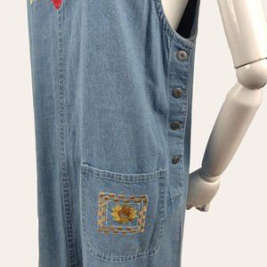 Gorgeous grunge wide arm sleeveless chambray jumper dress in 100% cotton, simple sheath construction w two front pockets. Perfect for layering w long sleeves beneath & jackets, sweaters atop. Two side slits for easy frolicking. Border, neckline & pocket embroidery in warm colors that resemble quilted applique hearts & sunbursts. Side buttons underarm along bodice.