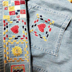 • Soft blue chambray adorned in embroidery of quilt hearts & sunbursts