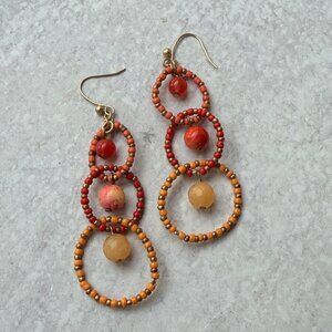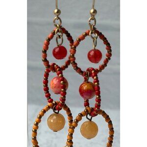 Vintage 1990s Chico’s Beaded Loop Dangle Earrings Red Orange Brass Statement
