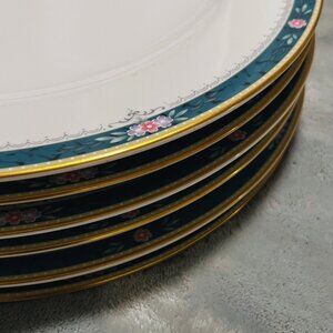 Bring 1990s charm to your table with this set of six Christopher Stuart Somerset (Y0207) dinner plates. Made of fine china, these vintage plates feature a teal border with delicate pink florals and gold trim. Discontinued and collectible!