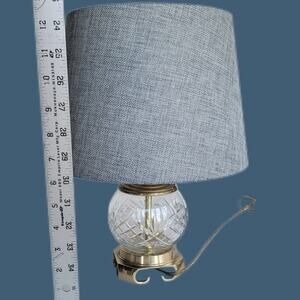 Petite bedside table lamp lamp made from a cut crystal globe with a heavy, solid brass Asian inspired base, graduated brass cap on the crystal globe, and has a contemporary woven grey shade. Modeled after the Waterford Lismore and is very good quality. Measures 12.5" with shade.
