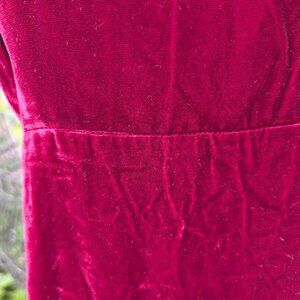 Item ID: Jordan Dress C18 / Vintage 1990's blood red velvet backless evening gown by Jordan. The ULTIMATE vampy evening gown!! This is a super sexy darkest blood red 100% acetate softest velvet full length evening gown. Features a high neckline with high cut sleeves and a daring cut out back that ties at the back of the neck with extra long ties. Zips at the back of the waist with a hidden nylon zipper with a hook and loop closure just above the zipper. Empire stitched waist. Fully lined with matching lining. The ultimate 90's vamp look!