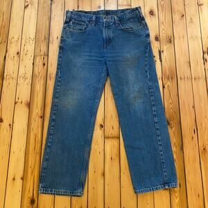 Vintage 1990s Carhartt jeans tagged 36x30. Made in Mexico aka 90s. Some stains/discoloration on knees/thighs as pictured