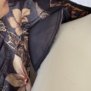 Lightweight jacket/overshirt from Essay by Sharon Anthony. Black with brown leaf and floral print. Ties at the front with strings on either side, can also be worn open. Has shoulder pads sewn in, but can easily be cut out.