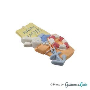 Vintage plastic brooch featuring a cute bunny with blue sailor clothing inside a flower pot pulling an anchor. The flower is decorated with a lifesaver and a sign that reads "Happy Easter".