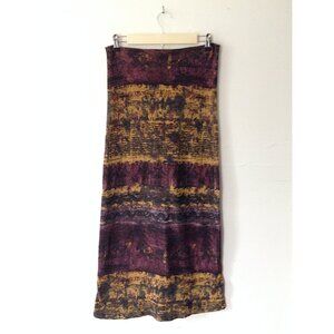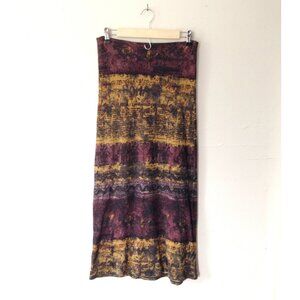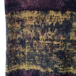 Maxi skirt from Jean-Paul Gaultier Classique. Dates to the early/mid 1990s- another vintage seller told me it's from 1992 but I haven't been able to confirm the date. Made from wool blend jersey printed in a cryptic stripe pattern that's overlaid with tiny cursive and block lettering- the all caps portion is very JPG does Basquiat. The print's done in dark aubergine purple, golden yellow, a deep pine-y green, black and has small pops of ivory/white. A snake wends its way horizontally through the print, outstretched hands can be seen in the background of the deep plum bands and there are even hidden backwards 'Gaultier's in the pattern. Between failing eyesight and terrible Spanish I can't make out the cursive. Some of the block lettering says 'Mi musa es un diablillo con [?] de ange' and 'color di sangre'.