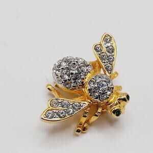 This vintage 1990s Joan Rivers bee brooch is a sparkling and collectible piece of designer costume jewelry. The brooch features a charming bee design, encrusted with shimmering clear pave rhinestones and accented with striking green rhinestone eyes. Measuring 1 1/4 inches, it’s a petite yet eye-catching accessory, perfect for adding a touch of playful elegance to any outfit.