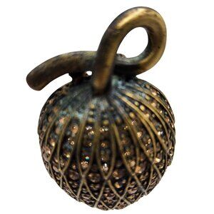 Charming 1990s Joan Rivers strawberry brooch crafted in warm brass tone metal, adorned with faceted brown crystals that shimmer beautifully against the antiqued finish. The sculptural detailing and textured metalwork showcase Joan Rivers’ signature blend of playful design and timeless elegance.