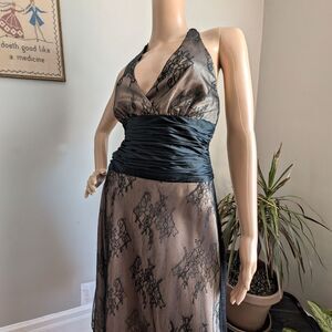 Vintage 1990s Jones New York Halter Dress Lace Satin Midi Formal Gothic Size 6