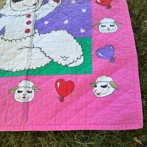 Vintage quilted toddler blanket featuring beloved 1990s character Lamb Chop (created by Shari Lewis).