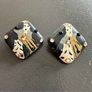 Vintage 1990s Leather Square Clip On Earrings Diamond Jewels 90s Animal Print