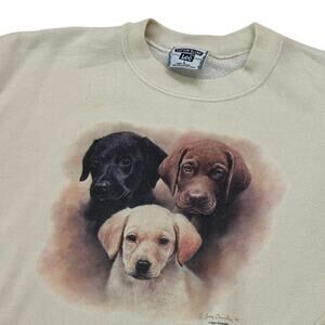 Adorable vintage 1990s Lee sweatshirt featuring a trio of Labrador puppies — black, chocolate, and yellow — in a soft airbrushed art style by artist Larry Chandler. Made in the USA with a cozy cotton-blend fleece interior. A classic, nostalgic piece for dog lovers and vintage collectors alike.