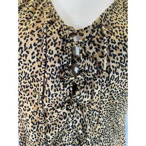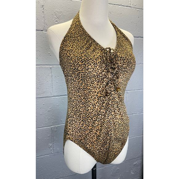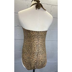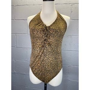 Vintage 1990s Leopard Print Halter Lace Up Bust High Cut Ome Piece Swimsuit M/L