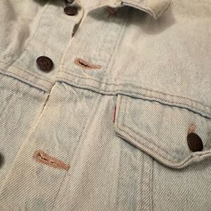 Vintage 1990’s Levi’s Denim Jacket. Light Wash Trucker style size Small. Classic button-up front with branded hardware and two chest flap pockets with button closures. Has two slanted side hand pockets and adjustable waist tabs at the back hem