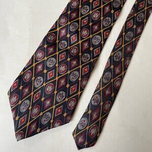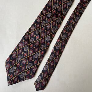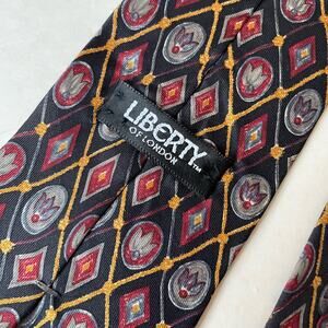 Add a touch of vintage sophistication to your wardrobe with this exquisite Liberty of London silk tie from the 1990s. Crafted from luxurious Italian silk, this tie features a classic design in black, maroon, and gold. Perfect for adding a refined touch to any outfit. Made in the USA. Geometric pattern