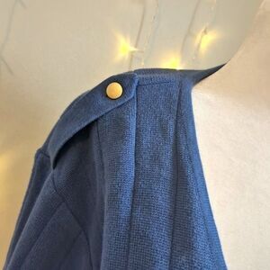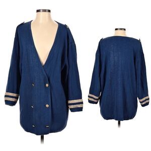 Vintage 90s Lizsport by Liz Claiborne knit cardigan sweater. Ribbed. Double breasted, gold metal buttons. Blue with metallic gold details. Oversized. Shoulder pads removed. Epaulettes on shoulder. Military/nautical. Cardigan is in good vintage condition with light wear to knit.