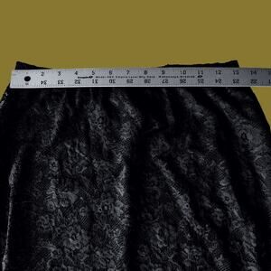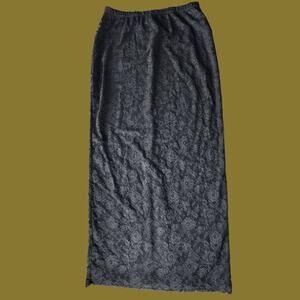 From your goth grandma's closet is this long lace skirt made by Carol Little in the late 1990s. Grandma would have bought this at a department store and wore it with Doc Martins, much to her parent's disappointment. The sheer black floral lace sheath is lined with a thin layer polyester as a lining but it is still a bit sheer. Measurements in photos.