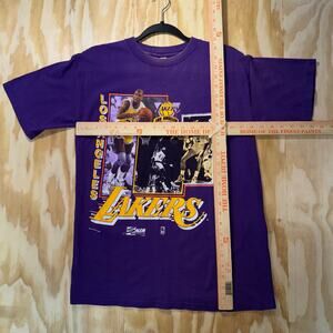 Vintage / Y2K Los Angeles Lakers faded T-shirt, single stitch top and bottom crazy piece 1980s/1990s era licensed to Salem sportswear 1990 Magic Johnson, james worthy, vlade divac NBA, basketball team big jumbo print front graphic