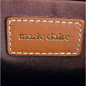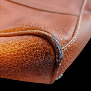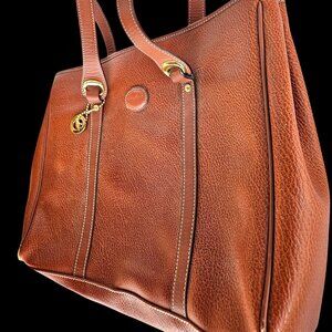 Step into timeless 90s classic professional fashion with this Marie Claire cognac leather shoulder tote, made of pebbled leather with gold-tone hardware and a spacious, structured design. Note imperfection on bottom piping!