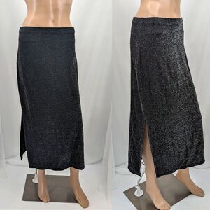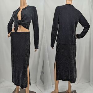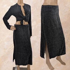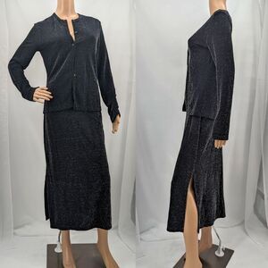 Vintage 90s Nexxen skirt and cardigan 2 piece set. Metallic silver/gray. Stretchy, unlined knit material. Button front cardigan. Slit on midi skirt. Set is in fairy to good vintage condition. Small cut in sleeve, please see photo. There are loose metallic threads and pilling throughout.