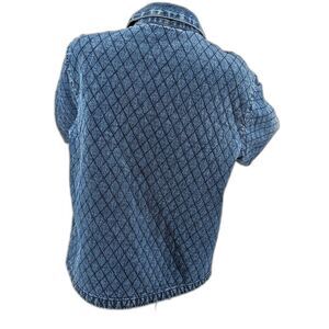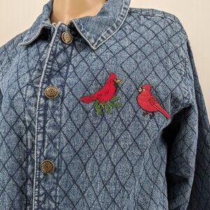 Vintage 1990s PTNY quilted denim jacket. Long sleeves, metal button front. Collared. Embroidered cardinal patch on pocket and chest. Rhinestone detailing. Unlined. Cottagecore/granny chic. Jacket is in good vintage condition with light wear, some loose threads, and pilling inside jacket.