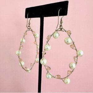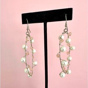 Vintage 1990's Pearl and Pink Crystal Beads Drop Wired Hoop Pierced Earrings