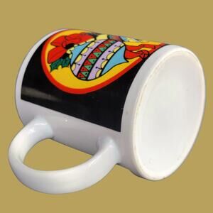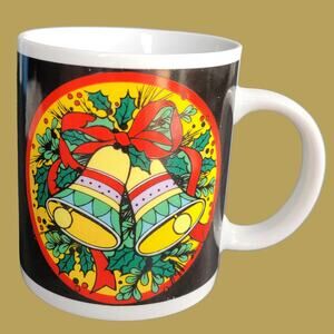 Bold, colorful Christmas mug made from white ceramic with a black band around the circumference of the mug, and large round deep yellow graphics with holly and bells on one side and an ornament and a bell o0n the other. Unique color way, very Post Modern.