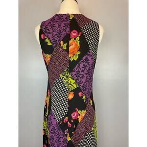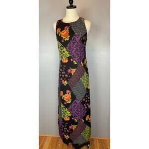 Vintage 1990s printed patchwork polyester sleeveless maxi dress.