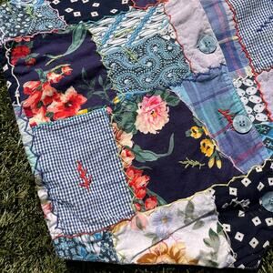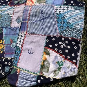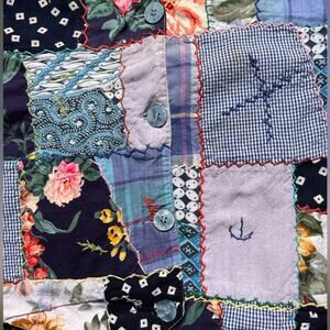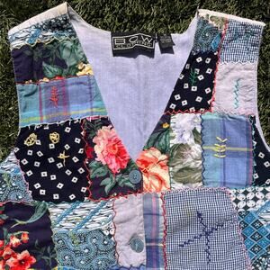 True vintage, straight from my grandma’s closet! From the late 1980’s or 1990’s. This vest featured a variety of fabric prints, with hand stitching, florals, and plaid patterns. Quilted together across the front. Lined with a light denim or Linen blend fabric.
