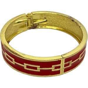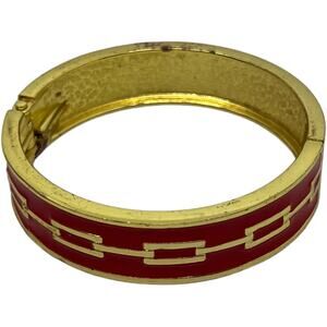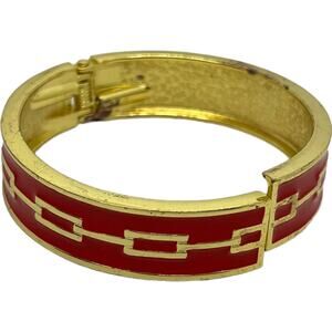 Classic 1990s statement bangle featuring a bold geometric chain link design. The bracelet combines red enamel with gold-tone metal for a striking contrast. The continuous chain link pattern is raised against the red enamel background, creating an elegant Art Deco-inspired look. Features a secure hinged closure for easy wear.