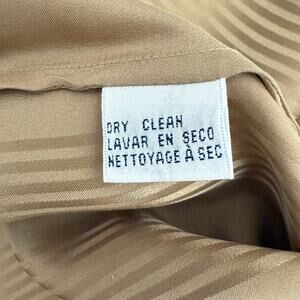 1990s Rena Rowan silk button-front shirt in brown/taupe vertical stripes for a minimalist designer look. Lightweight silk drape gives tailored ease for office or elevated casual styling. Clean lines and classic collar make this a versatile timeless piece.