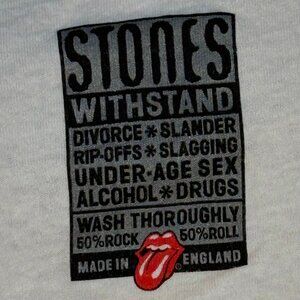 Authentic Rolling Stones tour shirt from the !994-1995 Voodoo Lounge World Tour. The small graphic on the back says "Stones withstand Divorce Slander Rip-offs Slagging Under-Age Sex Alcohol Drugs Wash Thoroughly 50% Rock 50% Roll Made in England"