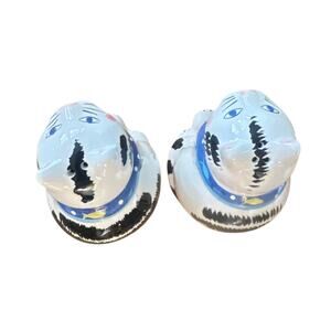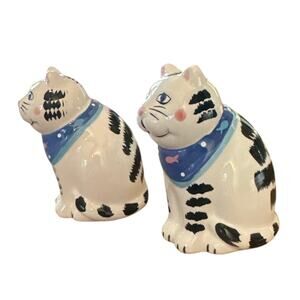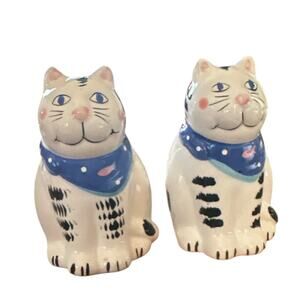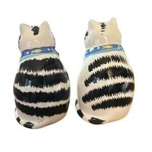 This ceramic set features two hand-painted cat-shaped shakers, each measuring 2.25" in length, 2" in width, and 3.5" in height. Made in Taiwan.
