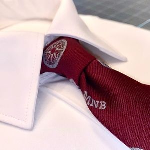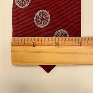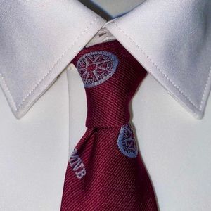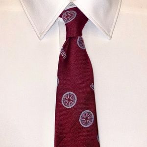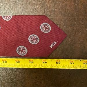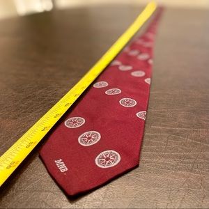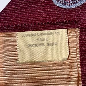 This tie has a story to tell! The Cappuccino brand specially made this tie for Maine National Bank, which went under in 1991. This tie is thus— at the earliest— from that year, but could very well be from the 1980s. Given the minimal 30 year age of the tie it is in superb condition, as evidenced by photos.