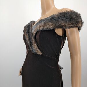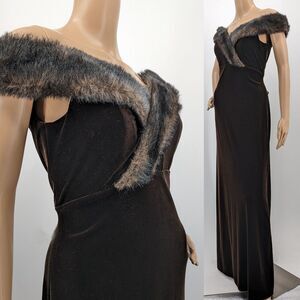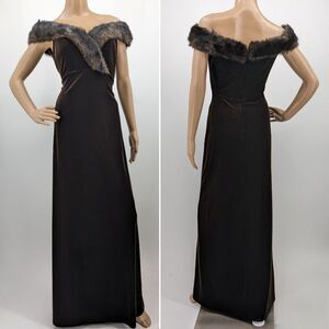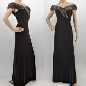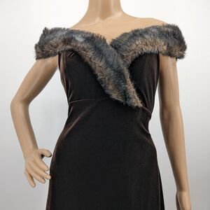 Vintage 1990s dark brown velvet evening dress with faux fur at neckline. Off the shoulder formal look. Unlined with stretch velvet. Zip up back. Maxi gown length. Dress is in good vintage condition with light wear and no flaws.