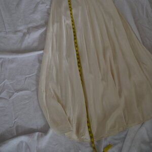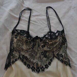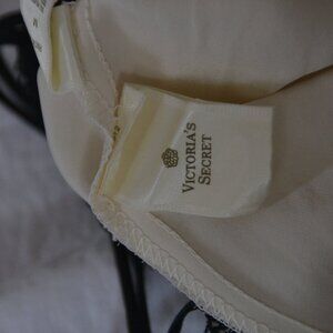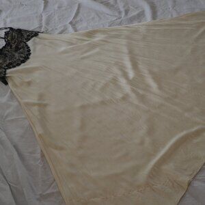 Vintage 1990's Victoria's Secret 100% Silk cream/black lace night gown, size Medium. Measure approx 56 inches long (strap to bottom). Gently worn and in very good condition. Features soft Silk padded cups and straps (are not adjustable but you can knot where you want them). Not worn very many times. Freshly hand laundered (hence wrinkles, which will come out). Dry Clean or Hand Wash per tag. VS gold tag. Made in USA.