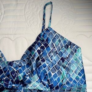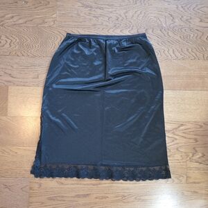 Adjustable straps. Bust and back are satin-like polyester. Lettuce hem. Ribbon bow. Asymmetrical sheer body. From 1996