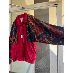 Vintage 1990's Westbound Sport red windbreaker jacket with plaid strap pattern on the sleeves. There are no major stains, holes or tears. The tag says size large. Please check measurements before purchase!